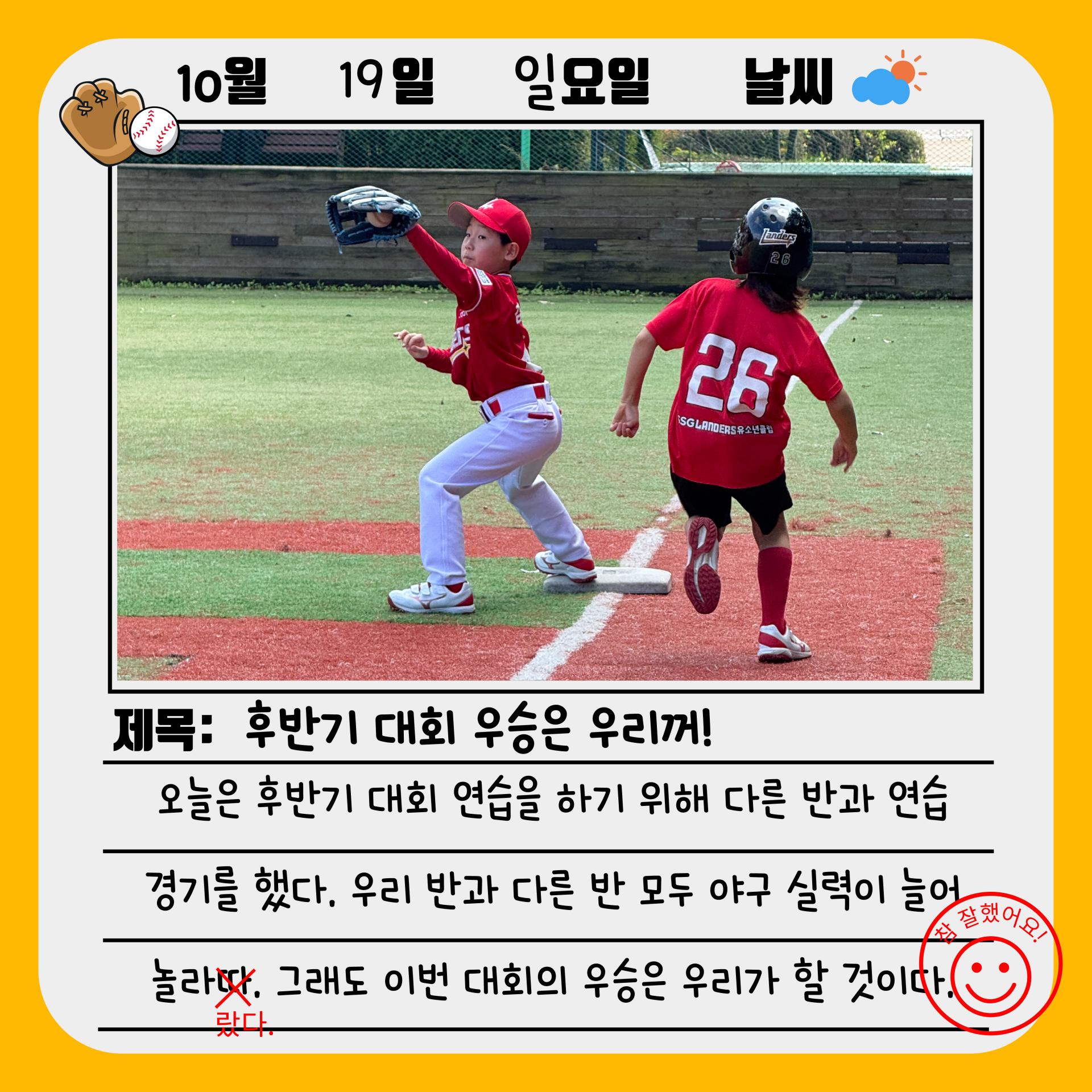 아이들은 집중력과 팀워크를 발휘하며 적극적으로 뛰고, 코치님의 지도 아래 타격 자세 및 수비 동작을 점검하였습니다.이번 연습 경기를 통해 자신감을 높인 아이들은 다음주 대회에서도 좋은 경기력을 보여줄 것으로 기대됩니다.